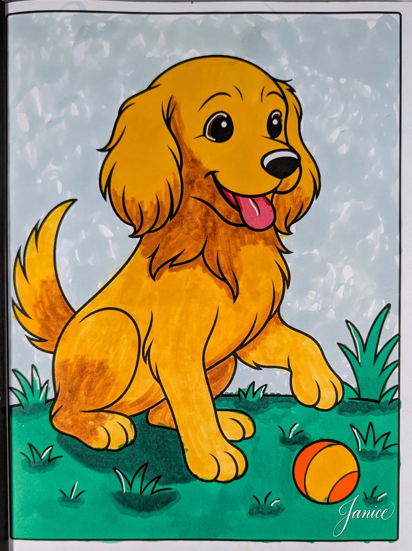 Absolutely golden! Janice has done a wonderful job bringing this cheerful Golden Retriever puppy to life from our 'Cute Puppy Breeds Coloring Book'. The warm amber tones, rich shading on the coat, and vibrant green grass make this pup look ready to leap off the page — ball at his feet and tail wagging!
